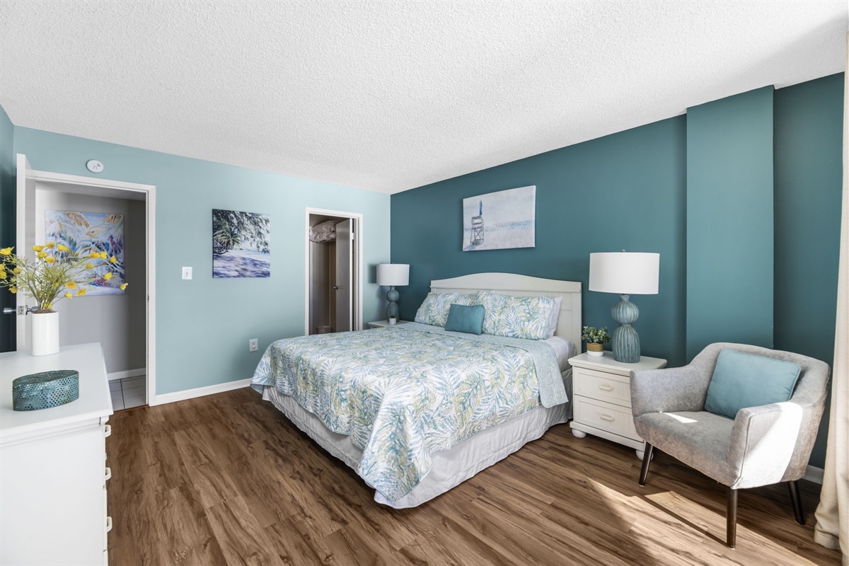 Relax in the master bedroom with a king bed and private balcony access, fall asleep to the sound of the waves, and wake up to a sunrise over the Atlantic. The second bedroom offers two twin beds, and the living area includes a queen sleeper sofa, allowing space for up to 6 guests.